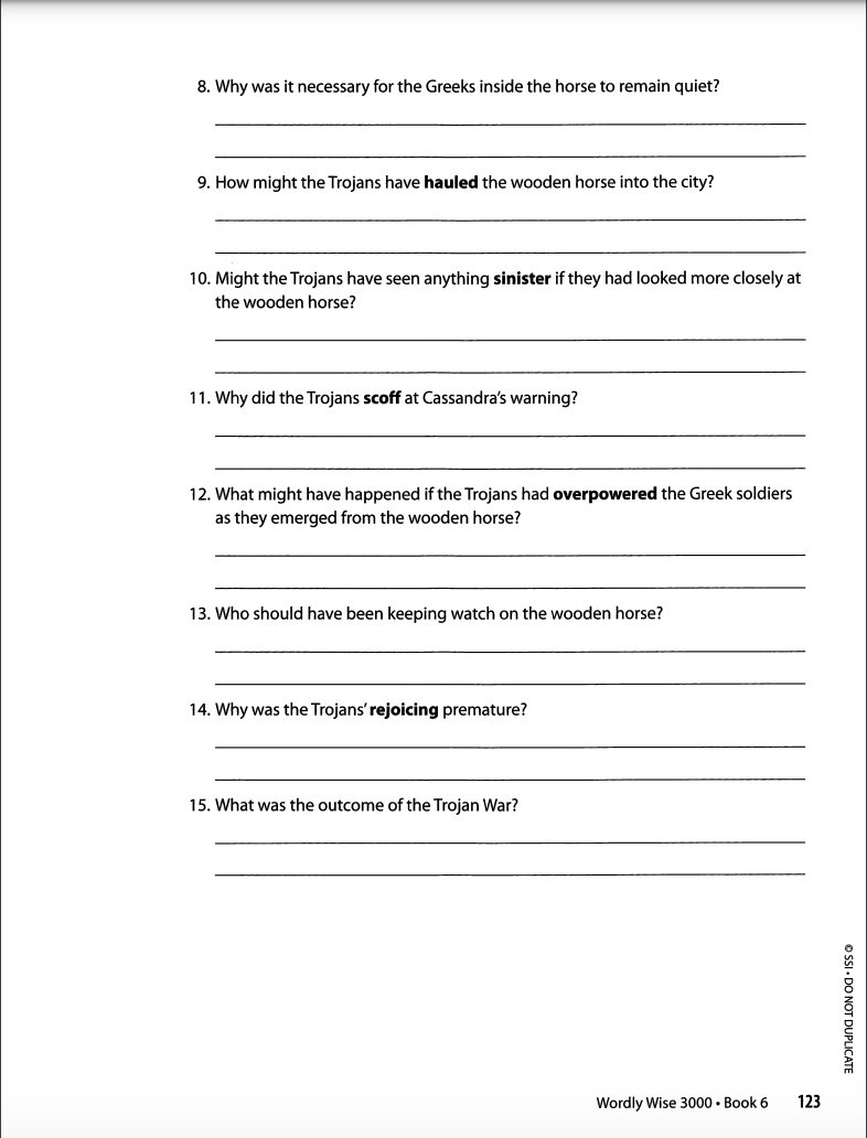 Answer all of the QUESTIONS below the longer version of the Trojan Horse story. Answer with complete sentences. Be sure to use the bolded vocabulary words in each answer. When you find a question that does NOT have a bolded vocab word in it, find the appropriate vocabulary word in the text that can be used in the answer. BOLD the vocabulary words in your answers.